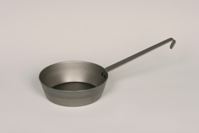 Seit 1550 – lange bevor wir Pfannen aus Emaille herstellten – erzeugt unsere Familie Eisenpfannen. Unsere Eisenpfannen werden kaltgeschmiedet, dabei wird eine ausgestanzte Stahlblechscheibe (Ronde) unter hohem Druck in eine Tiefziehform gepresst. An den Pfannenkörper wird ein Stiel befestigt, der immer eine Aufhängevorrichtung (Loch oder Haken) hat, damit man die Pfanne wie früher üblich hängend aufbewahren kann. Unser Modell Tirol hat überdies einen besonderen hohen Rand.