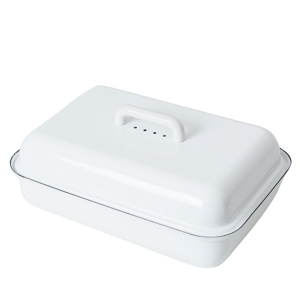 Die Emaille-Brotdose in puristischem Weiß ist rechteckig und hat die Maße: 37×26 cm, Höhe 13 cm