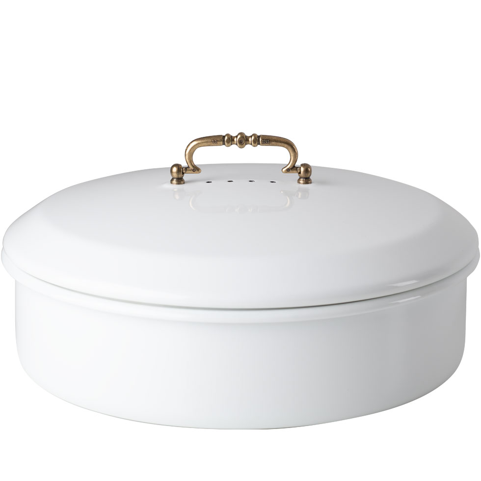 Die Emaille Brotdose war vor 100 Jahren die beliebteste Art Brot lange frisch zu halten und die wunderbaren Brotaromen zu bewahren. Diese Emaille-Brotdose hat die klassische runde Form und einen dank des Messinggriffs leicht abzunehmenden Deckel.