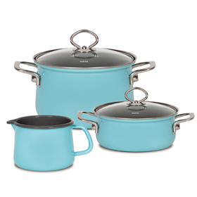 Unsere Serie Nouvelle gibt es nicht nur als kleines Geschirrset/Kochset, wenn man einen Haushalt startet. Man kann weitere Kochtöpfe sowie eine Bratpfanne der gleichen Farbe beliebig ergänzen.